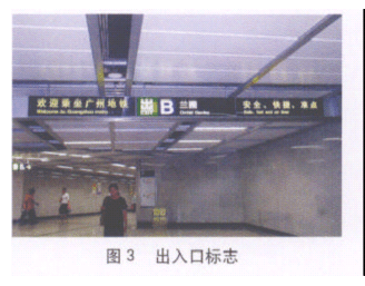 用著名旅游点或大型公共设施给通往该方向的出入口命名,如2号线越秀公园站的B出口附近有广州有名的兰圃公园,所以B出口的向导牌上标有兰圃的中英文字样(图3)。