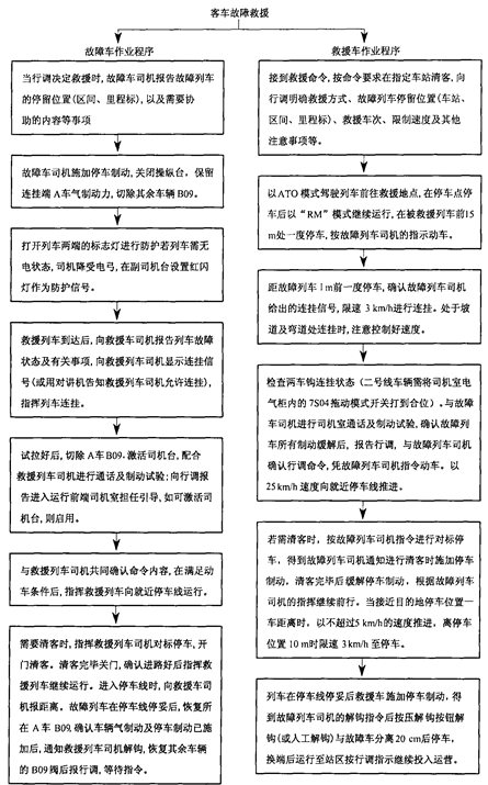 当列车故障失去动力不能恢复时,由于信号的原因,故障列车就要利用后续列车进行救援;救援车将故障车迅速推入就近停车线,尽快让正线恢复运营。广州地铁在线列车出现故障需要救援时的程序如图1所示。