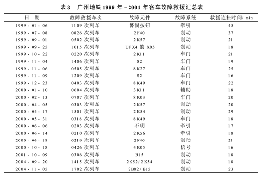 从广州地铁客车故障救援发生的频率来看,地铁开通运营的前两年,设备的故障救援率较高,之后故障救援率降低至每年1~2次(见表3)。由此可见,停车线设置过密,也没有必要。此外,地铁应与其他交通工具建立应急接驳机制,在地铁发生运营阻塞时,能够调集车辆与地铁形成接驳。广州地铁1999年至2004年客车故障救援汇总如表3。
