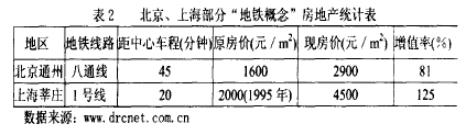 第二、“利益补偿”原则。考虑到地铁作为一个服务大众、公益特点突出的产品。本身经营利润前景并不乐观,但是由于地铁大大改善了沿线的交通状况,使沿线各站形成许多新的繁华地区,沿线的地产也不断增值。对北京、上海等地的“地铁概念”楼市的增值统计见表2。在这个过程中,可以说是地铁公司为沿线的地产发展商带来了收益。因此,让地铁公司分享地铁沿线物业发展的收益,于情于理,都是合适的。政府通过将地铁站出口处一定范围的土地,批给地铁公司发展楼宇物业,弥补了地铁公司本身经营可能带来的亏损,并解决了工程建设部分资金。同时,政府还将地下铁路内的通讯设备,广告等也批由地铁公司经营,保证其资产的保值增值。