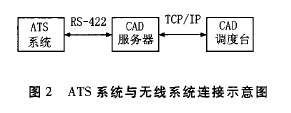 ATS和无线系统设备都安装在控制中心,2个机房相距较近,可直接使用RS422接口连接。无线调度服务器(CAD)把收到的列车报文传给行车调度台和车辆段调度台,如图2所示。