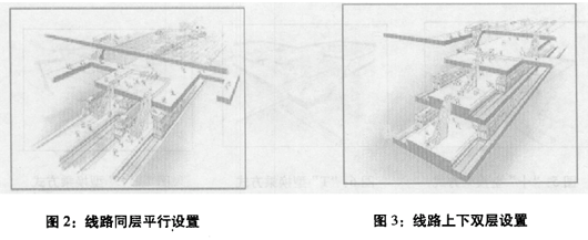 两车站同层平行设置,通常有双岛和侧岛两种形式(见图2),乘客通过站台直接换乘,换乘最为方便,换乘设施工程量小;该方式容易导致换乘楼梯口人流聚集。两个车站上下重叠设置,站台上下对应,双层设置(见图3),这种设置便于布置楼扶梯,换乘方便,通常采用岛式站台,采用区间线路交叉进行调整,四条线路可进行多种组合形式的布置;该方式车站结构难以分期实施。