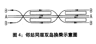 图4表示相邻两站通过调整区间线路平、纵断面可实现各个方向同站台平行换乘,换乘十分方便;但是工程实施难度大,运营条件不太好。