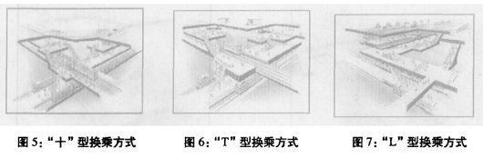 根据上述原则,结合两条线路常见的相互交织形式,如垂直交叉、斜交、平行交织等情况,换乘方式可分为同站换乘、通道换乘、站外换乘和组合式换乘等多种形式。在换乘方式的构思过程中充分运用无缝换乘的理念,最大程度的方便乘客。