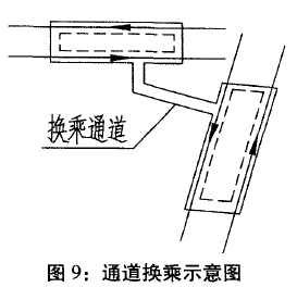 在两线交叉处,车站结构完全脱开,用通道和楼梯将两车站连接起来,供乘客换乘。连接通道一般设于两站站厅之间,也可直接设置在站台_L。通道换乘方式布置较为灵活,对两条线路交角大小及车站位置有较大适应性,预留工程少,甚至可以不预留,容许预留线位置将来可以作适当调整。通道宽度可按换乘客流量的需要设计。换乘条件取决于通道长度,一般不宜超过100m,这种换乘方式最有利于两条线路工程分期实施,预留工程最少,后期线路位置调节有较大的灵活性。