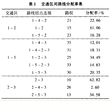 由前所述,对于城市道路交通网络,θ的取值范围在3. 0一3. 5,故在此取θ=3. 25,代入模型进行计算。根据多路径交通分配模型计算出交通区间各出行路线的分配率,具体见表1。