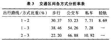 应用式(3)进行计算,得到交通区各方式的出行分担率,如表3所示。