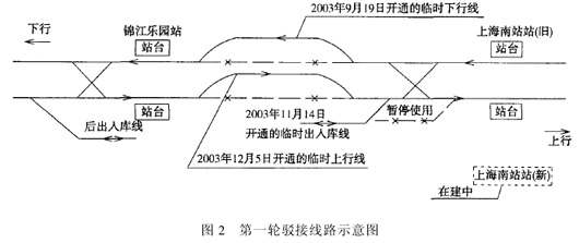 (1)2004年10月28日开通新建的入段线,将已停用的入段线顺接到新建的入段线,通过交叉渡线与新建的上、下行线连通。
