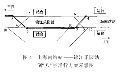 2)为尽早让施工人员进入上海南站站———锦江乐园站下行区间进行施工准备,同时保证下行最后3列车正常运行至莘庄站,在上海南站站———锦江乐园站采用倒“八”字运行,即上海南站站———锦江乐园站区间利用上行线反方向运行;同时在锦江乐园站加强引导乘客在上行线乘坐下行方向列车。如图4所示。