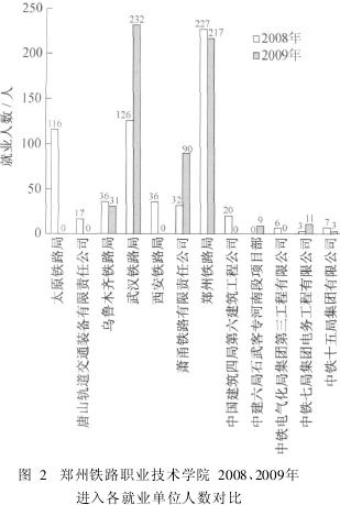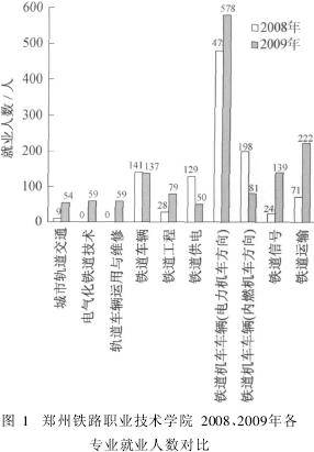 近2年,郑州铁路职业技术学院铁路和城轨方向的总就业人数从1 078人到1 458人,增加了380人;龙头专业———铁道机车车辆两个方向的就业人数明显高于其他专业,分别占就业总人数的62. 71%(2008年)和45. 20% (2009年);其次是铁道运输、铁道信号的人数增长最多,分别从24人(2. 23% )和71人(6. 59% )增长到139人(9. 53% )和222人(15. 23% );城市轨道交通、电气化铁道技术、轨道车辆、铁道工程的人数2009年较2008年分别增加了2. 87%、4. 05%、4. 05%、2. 82%,铁道车辆和铁道供电分别减少了3. 68%和8. 54%。建议学院开设或者继续开设相关专业。
