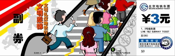 据北京地铁网消息:北京地铁定于2005年9月1日发行“文明礼仪地铁行”系列文化车票之“文明乘梯”,本套文化车票共4枚,从8月份起,每月的1号发行一种。本次车票发售地点:地铁1、2号线售票窗口;发行数量:6万张;售价:每张车票售价3元;使用范围:限用于地铁1、2号线。