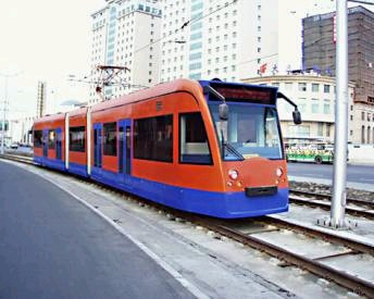 DL6WA型现代有轨电车由大连机车研究所与大连现代轨道交通有限公司合作研制,它由三节车厢双绞接组成,车长22.5m,宽2.6m,设计时速110km/ h,最高运行速度100km/h,额定载客242人,最大载客294人。与传统的城市有轨电车相比,该车采用70%低地板车体结构和直流斩波控制调速等新技术,其关节式铰接装置以及独立车轮从动转向架等技术在国内是首创,同时还应用了弹性车轮、电动塞拉门等先进技术,具有便于乘客上下车、乘坐舒适、运量大、噪声低、外形美观等特点。该车2001年7月通过了国家建设部的部级技术鉴定。
