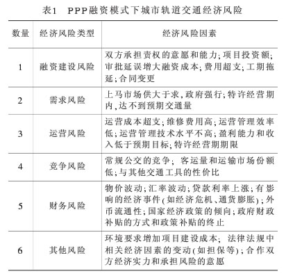 鉴于以上经济特征,经济风险无疑成为城市轨道交通项目的主要风险,主要包括以下几种:融资建设风险、需求风险、运营风险、竞争风险、财务风险及其他风险,具体的经济风险因素如表1所示。