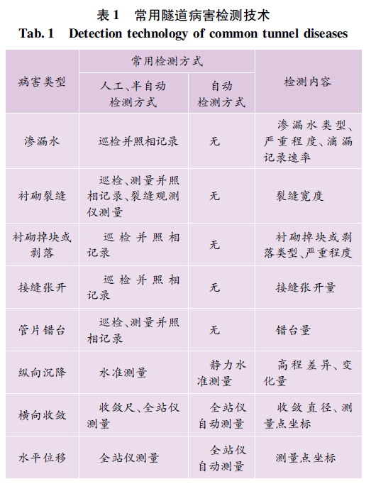 目前隧道结构病害检测存在的困难主要有:随着轨道交通数量的增加,日常检测工作量随之增加,但是 可供结构病害检测的窗口时间非常有限;以数字照相 和激光扫描为代表的隧道结构检测技术发展迅速,但 是针对检测获取的海量数据缺乏病害快速提取方法; 缺少能够同时检测多种病害的高效手段,尚未形成高 效的隧道结构病害综合检测体系。