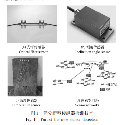 1) 在传感器检测技术方面,目前在隧道中的主要 应用有 4 种:① 利用分布式光纤传感器检测隧道纵向 变形[11] ( 见图 1( a) ),光纤传感器属于目前国际上最 前沿的尖端技术,它与传统监测技术相比具有分布式、 长距离、精度高和耐久性长等特点[12] ,可对沿光纤的 轴向应变进行分布式监测;② 利用无线倾角传感器检 测地下隧道的结构变形( 见图 1( b)),利用微机电系统( MEMS) 技术和无线传感器网络技术实现传感器自动 检测[12] ;③ 程妹菲、黄宏伟[13] 提出了基于温度传感 器的渗漏水检测法( 见图 1( c) ),以及基于电导率法的 渗漏水检测;④ 无线通信技术应用于隧道检测中,配 合传感器技术可以发挥更大的作用( 见图 1( d)),采用 无线通信技术可灵活安装在结构任意位置,监测节点 可方便地增加或减少,并且可以减少供电设备和线路的使用,节约隧道空间,监测网络节点愈多,其无线组网优势愈加明显[14] 。