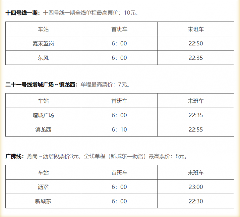 其中,十四号线一期和二十一号线增城广场至镇龙西段将于当天14时起运营,广佛线燕岗至沥滘段自当天首班车起开始运营。