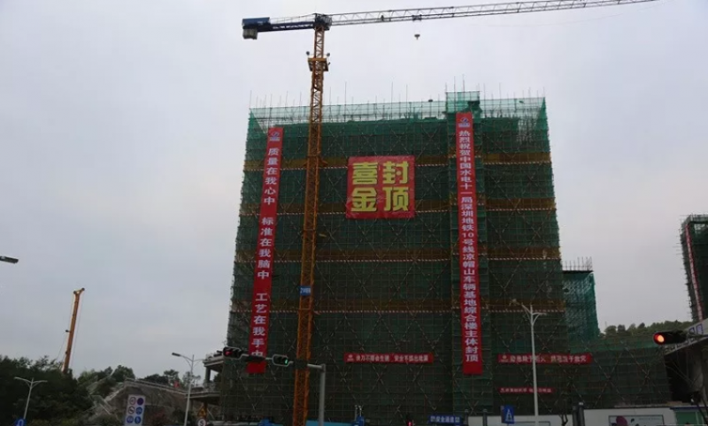 2018年,凉帽山车辆基地双层停车列检库、联合检修库、综合楼三大单体建筑相继完成封顶,用实力谱写了深圳速度、深圳质量。时值年末,综合楼提前实现封顶目标,既为全体参建人员一年的辛勤劳动画上圆满的句号,也为来年全面推动剩余施工任务的组织开展,奋力完成接车目标,力保2020年建成开通,努力建成百年工程、精品工程。