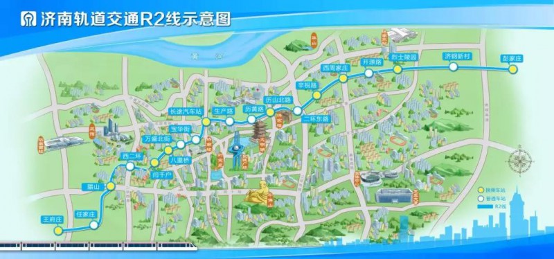 作为东西向的市域骨干线的济南市轨道交通2号线(R2线),同时兼具市区线路功能,连接西客站片区、腊山片区、西部新城核心区、老城区、高新区及唐冶新城等重点区域,串联济南西客站、中心城区的火车站、长途汽车站等重要交通枢纽,连接轨道交通1号线、3号线,并预留向东延伸的条件,对于缓解东西向交通压力、支撑带状城市空间拓展、实现济南东拓、西进、中优的城市空间发展战略具有重大意义。