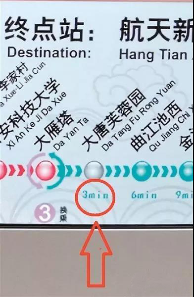 记者在车厢的显示屏中看到,当行驶至大雁塔站的时候,用绿色文字显示距离大唐芙蓉园站还有3分钟,曲江池西还有6分钟……且每隔15秒进行一次中文和英文切换,根据显示画面,乘客便可以直观地看到后续车站每一站的运行时间。