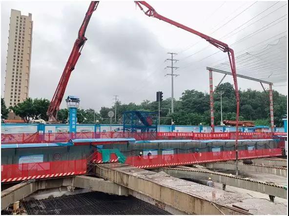 狮山公园站位于明秀东路、南梧路与邕武路、望州路十字交叉路口处,为地下两层岛式车站。标准段宽19.7m,扩大端宽23.8m,车站全长272m,设4个出入口、2组风亭、1组冷却塔。狮山公园站是5号线唯一一个跨大十字路口设置的车站,交通流量大、交通疏解困难;因处于老城区,一期主体用地内各类管线错综复杂,迁改难度大;主体基坑上方南方电网110KV高压电,严重制约施工组织;场地狭窄,车站仅有南侧一条施工便道,材料倒运、土方开挖受到严重制约。该项目自进场施工以来,通过进行交通疏解方案优化,将主体交通疏解由一期分解为3个阶段进行,见缝插针组织施工;考虑到管线迁改数量众多,在主体基坑首道支撑梁设置管线迁改管廊,管线集中迁改,大大增加迁改效率;针对110KV高压电下施工,创新地设置红外激光在线实时监控系统,保证施工作业安全;采取在基坑支撑梁上方铺设人行通道,实现人车分流,有效节约了场地。通过采取有效措施,该项目克服了交通疏解难度大、管线迁改困难、施工场地狭小、出土困难、周边环境复杂、雨季降水量大等不利因素。在参建各方共同的努力下,最终顺利完成了狮山公园站主体结构封顶。