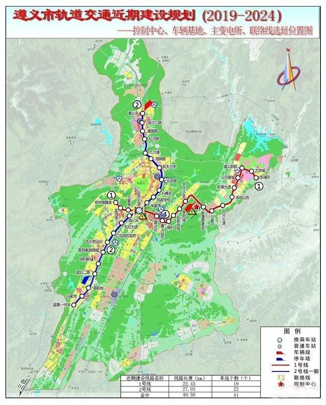 调整后的1号线和2号线一期工程,均采用跨座式单轨制式,运营时间为6:00—22:00,共设站41座、车辆基地2处、控制中心1处、停车场1处。2019年2月,为加快推进轨道交通项目前期工作,遵义市发改委向国家生态环境部提交了《遵义市城市轨道交通线网及近期建设规划(2019—2024年)环境影响报告书》。
