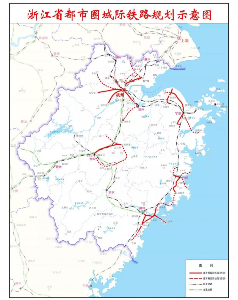 2014年12月16日《国家发展改革委关于浙江省都市圈城际铁路规划的批复(发改基础[2014]2865号)》在浙江省杭州都市圈、宁波都市圈、温台城市群、浙中城市群建设城际铁路,线网规划包括23条线路、总里程1413公里。作为区域城际旅客运输骨干,城际铁路网络覆盖区域内70%以上20万人口以上城镇,形成区域中心城市与重要城镇、组团之间1小时交通圈。杭州都市圈规划建设杭州-海宁、杭州-临安、杭州-富阳、杭州-绍兴4个项目,总里程132.2公里。