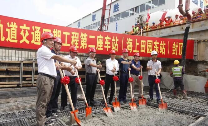 此次封顶的海上田园东站,位于民主大道与丰民路交叉口南侧,沿现民三路呈南北方向布置。车站为岛式二层车站,站台宽13m,地下一层为站厅层,地下二层为站台层。车站外包总长523.74m,标准段基坑宽22.2m,车站标准段结构外皮净高13.83m。车站主体为明挖顺筑法施工。