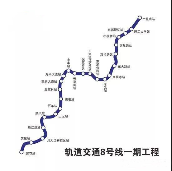 地铁8号线一期是连接中心城区内部以及连接中心城区与城区周边的关键线路。工程南起莲花站,北至十里店站。沿线主要经过双流区、武侯区、高新区、锦江区、成华区。线路全长29.1km,均为地下线,共设车站25座,均为地下站、其中换乘站14座,设车辆段1座。线路建成后,将起到加密中心城区线网,扩大轨道交通覆盖范围,提高轨道交通服务水平的作用。