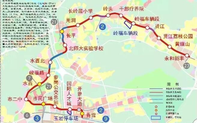 线路采用地面线,全长约14.4公里,其中,高架段(水西村至长平段沿南岗河)约 1.4公里,并设隧道两座:岭头下穿隧道和贤江下穿隧道。全线共设19个站,一座车辆段和一处停车场。