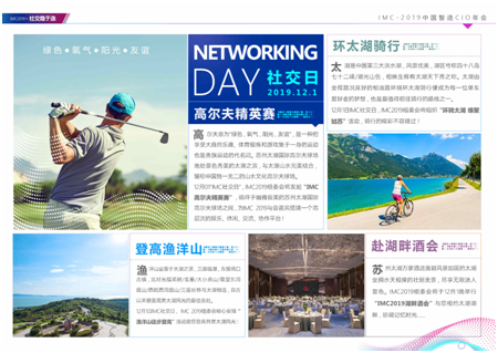 在12月1日“IMC社交日”,IMC组委会将精心组织高尔夫精英赛、环太湖骑行活动、渔阳山徒步登高活动等户外休闲运动,丰富嘉宾们的会议行程体验。晚间,组委会还将在万豪酒店举行湖畔酒会,嘉宾们在太湖湖畔的迷人夜色中结束一天的社交。