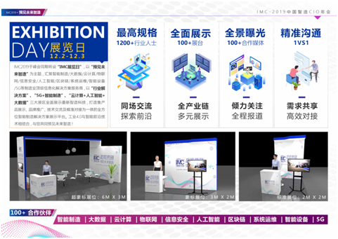 IMC峰会同期设置“展览日”,汇聚100+制造业顶级信息化解决方案服务商,以“行业解决方案”“5G+智能制造”“云计算+大数据+人工智能”三大展区,全面展示最新智造科技,打造集产品展示、品牌推广、技术交流、精准对接于一体的展示与合作平台,让制造企业和智能制造解决方案近距离接触!