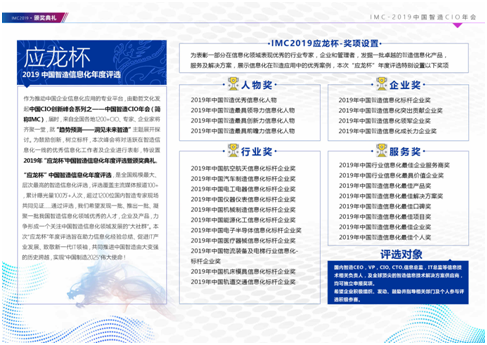 作为一项国内顶级规模、顶尖层次的智造信息化评选,2019“应龙杯”中国智造信息化年度评选将覆盖100+主流媒体报道,1200+智造专家共同见证。奖项设置分为“人物奖”“企业奖”“行业奖”“服务奖”四大类。通过评选,我们希望发掘、凝聚一批我国智造信息化领域优秀的人才、企业及产品,力争形成一个关注和致力于中国智造信息化领域发展的“大社群”!