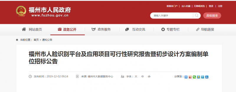 12月2日,福州人民政府网站公布招标公告,福州市大数据服务中心就福州市人脸识别平台及应用项目可行性研究报告暨初步设计方案编制进行招标。