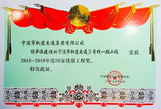 2019年12月8日,2018-2019年度国家优质工程奖表彰大会在北京国家会议中心举行,宁波轨道交通2号线一期工程荣获“国优”称号。指挥部(集团公司)党委委员、副总经理张付林参加表彰大会。