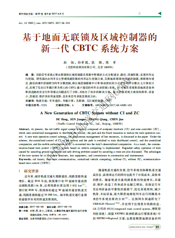 基于地面无联锁及区域控制器的新一代CBTC系统方案