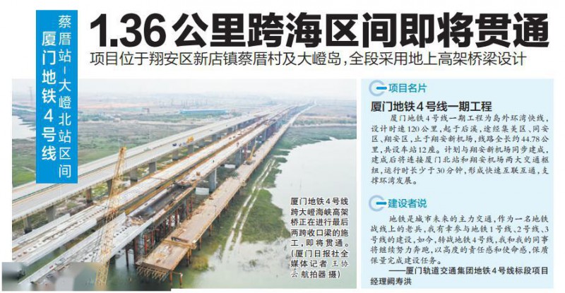 “等这两跨收口梁浇筑完成后,全长1.36公里的高架桥梁区间将全部贯通。”站在跨海高架桥上,厦门轨道交通集团地铁4号线标段项目经理阙寿洪告诉记者,目前,各参建单位正在合力攻坚,力争在4月实现蔡厝站至大嶝北站区间贯通。