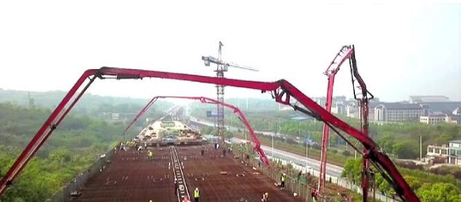随着混凝土泵车在施工现场的隆隆声响,工人们引导着泵管将混凝土注入模内,开始对长146米、宽24.5米、高2米的箱梁进行混凝土浇筑。