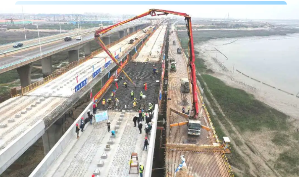 4月11日上午,厦门地铁4号线蔡厝站至大嶝北站区间跨越大嶝海峡的高架桥上泵车长臂里倾洒出混凝土对最后一孔收口梁进行浇筑,全长1.36公里的蔡大高架桥梁区间将全部贯通,地铁4号线这一重点节点工程取得重点突破。