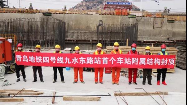 随着最后一方混凝土的成功浇筑,4月12日上午,青岛地铁4号线九水东路站首个附属结构1号风亭顺利封顶,成为全线明挖车站第一个封顶的附属工程。