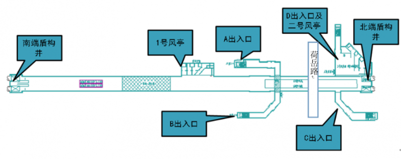大墩站设置在在荷岳路及文华南路(规划)交叉口,沿文华南路南北向设置,近期共规划4个出入口,A、B号出入口位于荷岳路南侧;C、D号出入口位于荷岳路北侧。