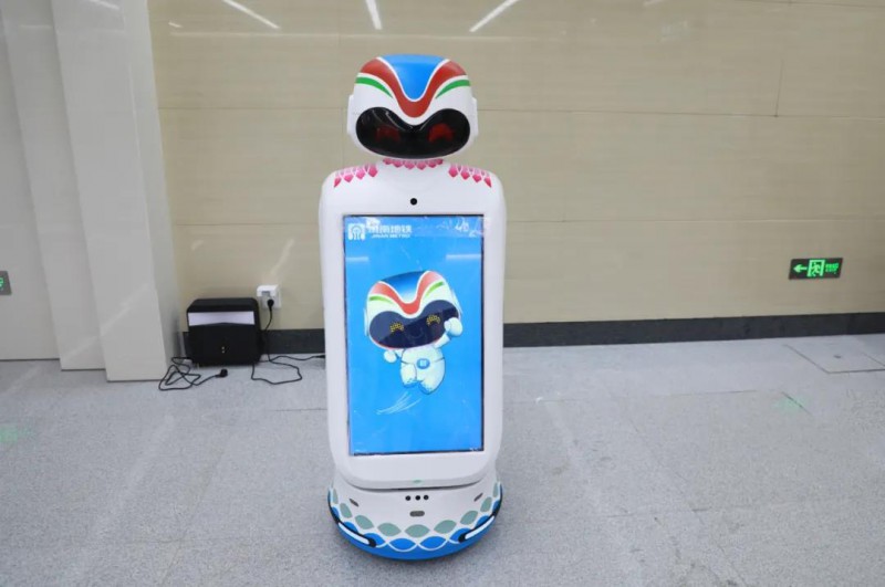 在3号线龙奥大厦站、奥体中心站、济南东站,可看到“小蓝”机器人。它以“泉速”为设计原型,重约100KG,高约1.6米,背部及侧面增加济南地铁logo,蓝白相间,清晰直观。它具备进化升级能力,在进入地铁站服务后,会越用越智能、越用越聪明。