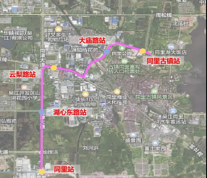 吴江捷运系统T1示范线南起轨交4号线同里站,沿同津大道,至云梨路右转,再转向大庙路,后右转至崇本路,线路全长5.2km,共设5个站分别是同里站、湖心东路站、云梨路站、大庙站同里古镇站(其中湖心东路站、大庙站为预留站)。