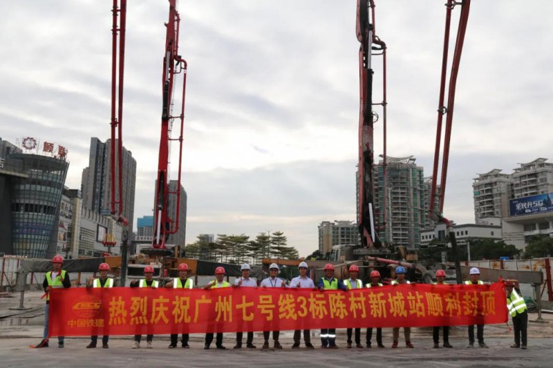 此次封顶的陈村新城站北接陈村站,南接南涌站,是7号线西延顺德段第5个车站。车站位于佛陈公路与陈村大道(白陈公路)交叉处,接近君悦酒店、顺联广场及陈村变电站,位于陈村镇的中心地带,人、车流量大,且车站下方分布着陈村镇各种管线的主管道,是全线最长且施工难度最大的站点。陈村新城站先后克服了封闭城市繁华中心地带的主干道并分4期进行交通导改、前后5期共迁改百余条通讯管线、DN1.2m大型给水管和DN1.0m污水管横跨基坑悬吊保护施工、净高13m的110KVA高压线下地连墙成槽及基坑开挖施工、长度58m的盖板结构下基坑开挖、主体结构施工及“新冠疫情”下大干等诸多困难,在各参建单位的共同努力下,工程安全、如期顺利推进。