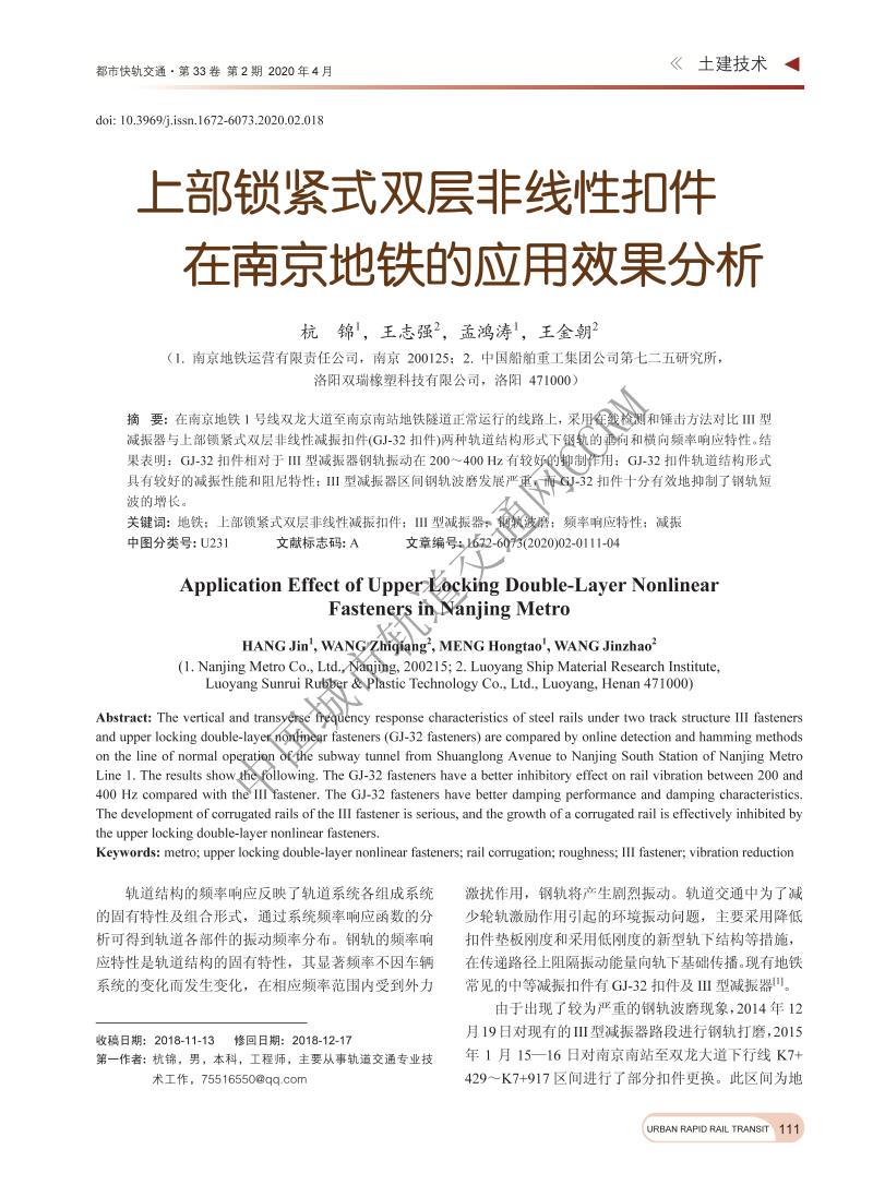 上部锁紧式双层非线性扣件在南京地铁的应用效果分析