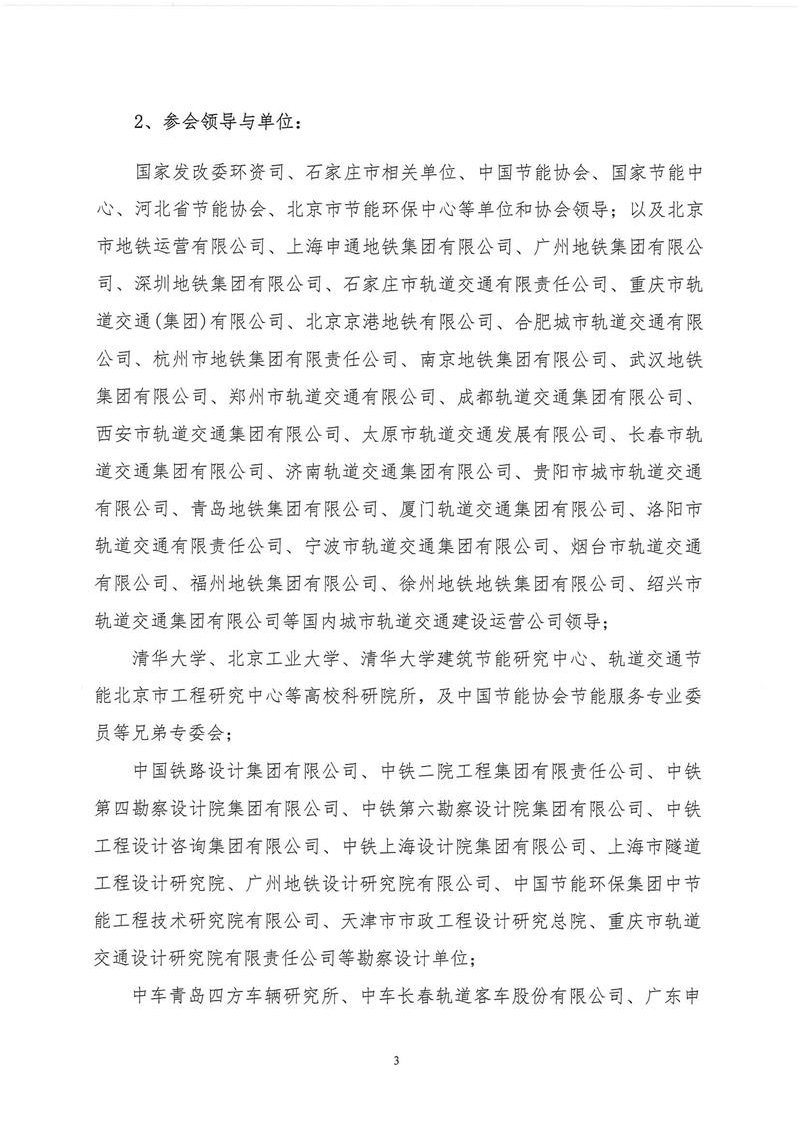 国家发改委环资司、石家庄市相关单位、中国节能协会、国家节能中心、河北省节能协会、北京市节能环保中心等单位和协会领导;以及北京市地铁运营有限公司、上海申通地铁集团有限公司、广州地铁集团有限公司、深圳地铁集团有限公司、石家庄市轨道交通有限责任公司、重庆市轨道交通(集团)有限公司、北京京港地铁有限公司、合肥城市轨道交通有限公司、杭州市地铁集团有限责任公司、南京地铁集团有限公司、武汉地铁集团有限公司、郑州市轨道交通有限公司、成都轨道交通集团有限公司、西安市轨道交通集团有限公司、太原市轨道交通发展有限公司、长春市轨道交通集团有限公司、济南轨道交通集团有限公司、贵阳市城市轨道交通有限公司、青岛地铁集团有限公司、厦门轨道交通集团有限公司、洛阳市轨道交通有限责任公司、宁波市轨道交通集团有限公司、烟台市轨道交通有限公司、福州地铁集团有限公司、徐州地铁地铁集团有限公司、绍兴市轨道交通集团有限公司等国内城市轨道交通建设运营公司领导;