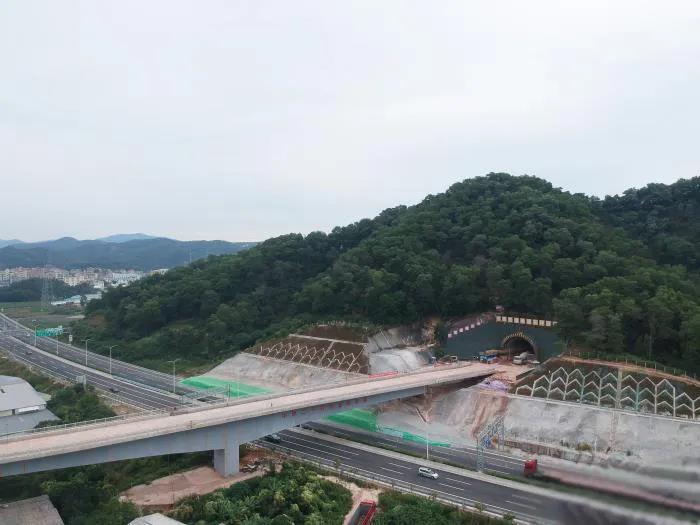 据了解,东环隧道是全线控制性工程,位于广州市白云区钟落潭镇,长891.42米,宽14.8米,高8.6米,设计为曲线隧道。该隧道所处地形起伏大,植被覆盖茂密,山体水资源丰富,最大埋深96米,最浅仅5米,岩体脆弱易软化,需穿过三段高风险破裂带,易发生变形塌方,施工难度大。由于隧道出口连接白沙村一号特大桥,下方是建成运营的花莞高速公路,洞口场地狭窄,材料机械等运输极为困难。