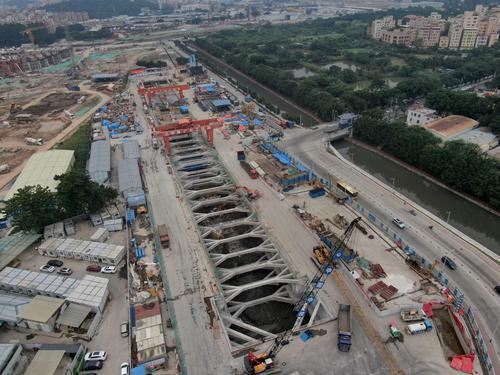 截至目前,十三号线二期土建工程累计完成21%;1座主体结构封顶,20座进行土建施工,其余2座进行前期准备;23个区间中,2个区间已贯通,9个正在进行土建施工,其余正在进行前期准备,鱼珠停车场和凰岗停车场正在进行土建施工 (文中车站名为工程暂用名)。
