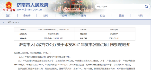 近日,济南市人民政府办公厅印发《2021年度市级重点项目安排》,共安排市级重点建设项目300个,为历年最多,总投资约1.6万亿元,年度计划投资3013.6亿元。其中,产业项目202个,年度计划投资1564.3亿元;城市建设项目98个,年度计划投资1449.3亿元。为保障项目接续,安排市级重点预备项目100个,总投资2068.4亿元。