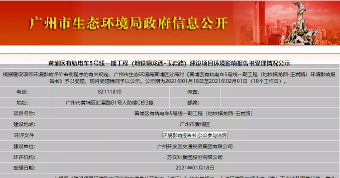 1月18日,广州市生态环境局发布了黄埔区有轨电车5号线一期工程(地铁镇龙西-玉岩路)建设项目环境影响报告书受理情况公示。此次公示期为2021年1月18日至2021年2月1日,共10个工作日。