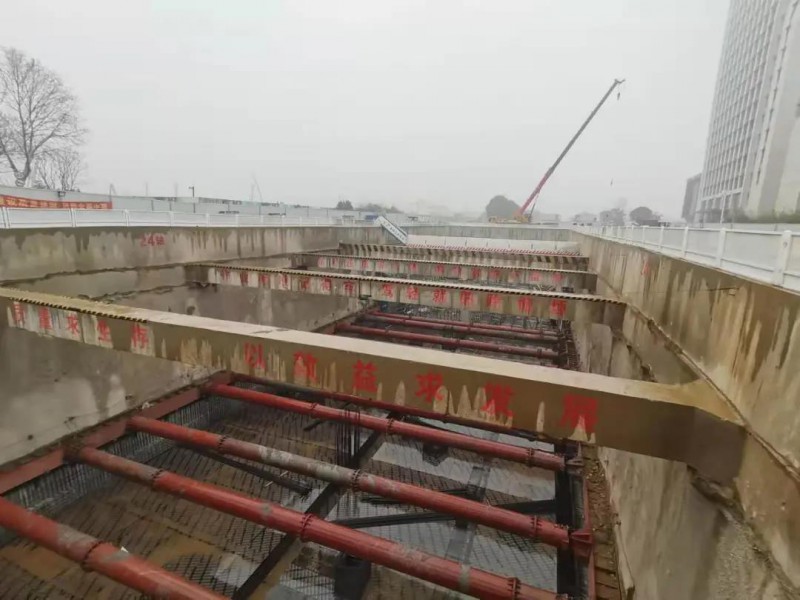 由于受到新冠疫情的影响,本工程于2020年3月1日才正式开工,项目部以“起步就是冲刺、开局就是决战”的精神跑步进场,4月完成绿化迁移及围挡上路,5月开始车站主体范围内的所有管线改迁,并开始车站主体桩基施工,10月开始冠梁支撑梁施工,11月开始基坑土方开挖,12月开始主体结构施工,工程有序推进。